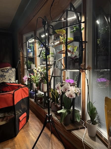 A spare table or rack can be turned into a brilliant little indoor orchid jungle like this.
